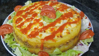 ثم طبقة البطاطس ثم الحشوة ثم نغطي بالبطاطس