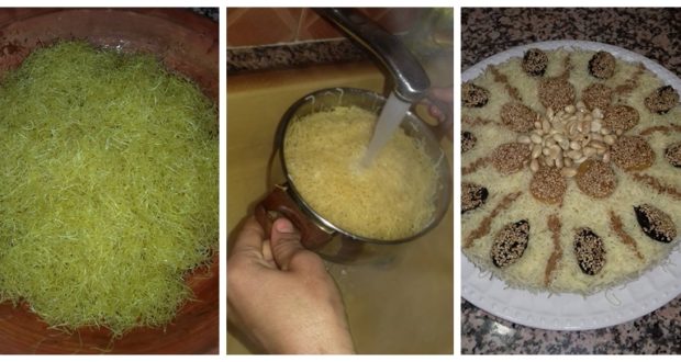 بالنسبة للشعرية بسبستها بالزيت و فورتها 4 المرات تقريبا الاولى كنسقيها في الكسكاس بالماء طايب والمرات الاخرين كنعاودها في القصرية بالماء البارد و قبل التفويرة الاخيرة منعاودهاش بالماء كندير الزبدة والسكر كلاصي ونخلطها وهي سخونة ونرجعها تفور للمرة الاخيرة ثم بعد ذلك نعمل النصف ديالها في الطبسيل ونعمل الحشوة ديال الدجاج ونغطيها بالنصف