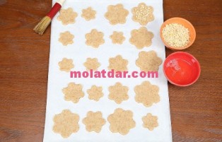 يوضع البسكويت فوق صفيحة ملبسة بورق المطبخ. للحصول على بسكويت مزين باللوز، يدهن البسكويت بأبيض البيض ويرش باللوز المجروش