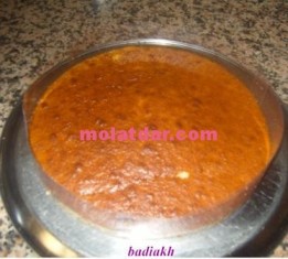 نخلط حتى تنسجم العناصر ثم توضع في المقلاة الثقيلة المدهونة بالزبدة والمرشوشة بالدقيق