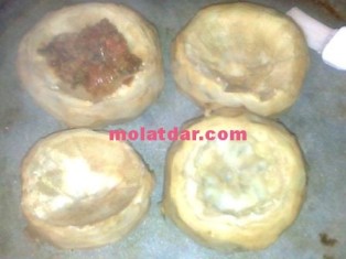 منبعد كنديرو قوق في اناء الفرن مدهون ونعمروها بالكفتة و الجلبان