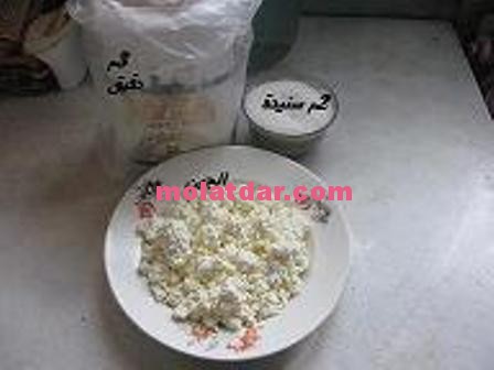 ناخذو نص كيلو الجبن نضيفو ليه 2 معالق سنيدة كبار +3 معالق كبار الدقيق عينك ميزان خاص الجبن يتجمع لينا بحال العجين لكن ماخاصوش ثاني يكون قاصح لازم يبقى خفيف بحال عجينة الكرص+قبصة ملح فين خلطوا كل شي انحصلوا على العجينة بحال لفي الصورة .