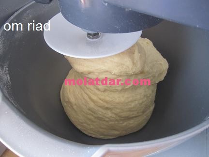 ثم نضيف الخمارة و الملح و الدقيق حتى نحصل على عجين ميكونش مرخوف يدلك العجين