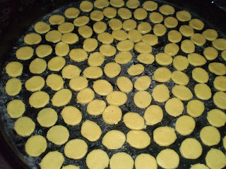 القطعة الثالثة تلون بالملون الغدائي الزعفران وتنسم بالحبة السوداء (السنوج)
