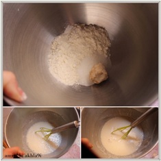 تندفيو الحليب واللبن ونخلطوهم مع السنيدة والخميرة و3معالق دقيق ونخليوهم شي 10 دقائق حتا يطلعوو