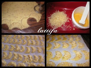جمعي العجينة خليها ترتاح نصف ساعة ومديها بالدلاك وضربيها ضربات خفاف بالمشط وشكليها هلالات
