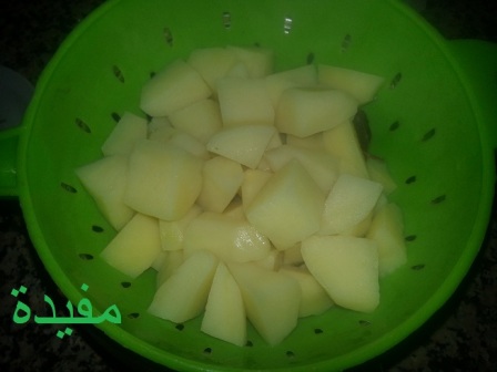 اول حاجة كنديرو البطاطا مقطعة مربعات كبيبرة في طنجرة نزيدو عليها شوية الملح ووريقات سيدنا موسى والماء الكافي غير تطلع فيهم الغلية ونطفيو عليها ونصفيوها