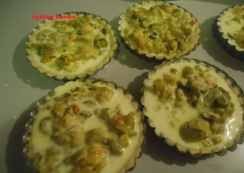 نطلق العجين ونضعه في المولات الصغيرة نثقبه قليلا نضع القليل من الحشوة ونغطيه بقليل من الخليط اللي طربنا سابقا
