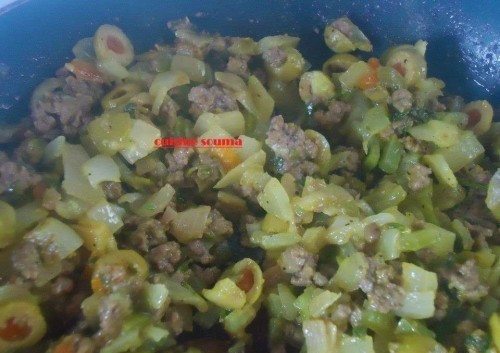 ناخد مقلاة نضع الزيت والبصل والفلفل حتى ينضج نضيف اللحم المفروم أو الطون أو صدر الدجاج والتوابل