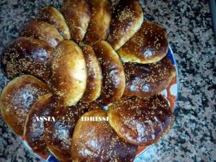 كنعجنو كلشي مزيان سنحصل على عجين رطب ولين ندلكه ونتركه يخمر تقريبا 2 ساعات ثم نعمل كويرات نكورهم ونكرصهم ثم نضعهم في لاطة مدهونة بالزيت ونتركهم يخمروا ثم ندهن ببيضة + خل + نيسكافي ونرش بزنجلان وندخلهم الفرن .