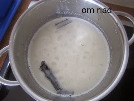 في إناء فوق النار نضع الروز و السكر و الفاني و أعواد القرفة و بدرة الحليب و ملح
