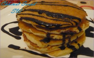 فقط هنا اضفت ملعقة صغيرة كاكاو وطهوت البان كيك على مقلاة ناشفة بدون مادة دهنية