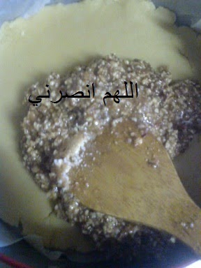 كاس سكر سنيدة+ربع كاس عسل +ربع كاس قشدة طرية+2معالق كبار زبدة+2 كيسان عنبة لوز مهرمش