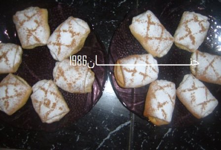 نعجنو الكل بالماء دافي وندلكوها مزيااان ونشكلها كويرات صغيرة في حجم الماندرينة ونسرحها بالزيت ونعمرها بالحشو بخال الصورة وندخلها للفرن ونزينها حسب الرغبة انا رشيتها بالسكر والقرفة