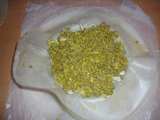 ثم اللوز المهرمش ثم نثني عليها أطراف أوراق البسطيلة ونغلقها بالطريقة التي في الصورة ثم نقلبها دون لصقها بأي شيئ