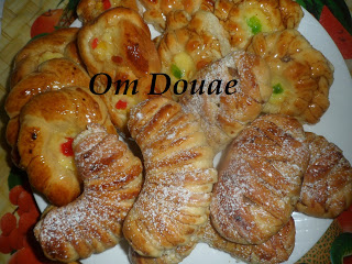 نوضعوهم فطاوة مدهونة بالزبدة مرشوشة بالدقيق نزينهم بالفواكه معسلة ونغطيو عليهم يخمرو من بعد ندهنوهم باصفر البيض مخلط مع نيسكافي وقطيرات الخل و ندخلوهم لفرن
