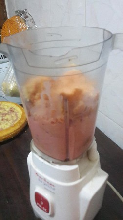 نصف لتر حليب+2فلان واحد فريز واحد عادي+2معاق سكر+2دانون جوكي+زلافة فريز مقطع رقيق مخلط مع 2معالق ك سكر ونخليه ساعة حتى