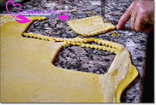 نمدد العجين ونقطعه شريط بالطول ندهنه بالكريم