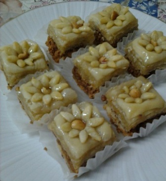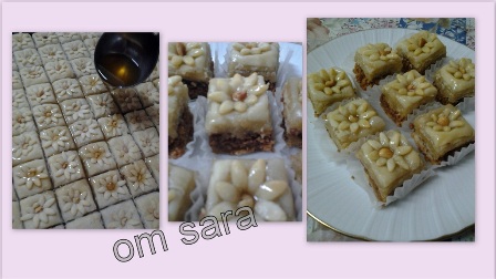 وبمجرد متطيب الحلوة نسقوها مزيان بالعسل ونرجعها للفران ونخلوها فيه تتبرد
