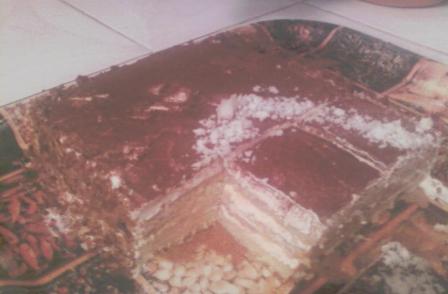 تم ندخلها للفرن الساخن راها دغية كتطيب عنداكو تتحمر بزاف و منين تطيب نخرجوها و نسقيوها بفانتا كاملة حت كتكون قاصحة بحال البسكوي شوية