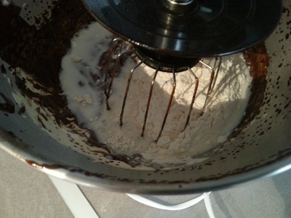-نعمل الأصفر +السكر ونضرب مزيان حتى يولي لون الخليط فاتح نضيف عليه الشكلاط مدوب مع الزبدة ونخلط ثم الطحين +الحليب ونرجع نخلط غادي الخليط يجيكم ثقيل عادي مين نضيف ليه أبيض البيض يولي خفيف نأخد الخليط ديال أبيض البيض ونضيفو على الخليط ديالنا ونحركو بملعقة غي بشوية حتى ما يبقاش يبان أبيض البيض وكلشي يمتزج مع بعض