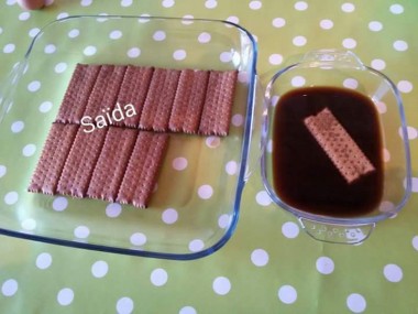 نبلل قطع البسكوت داخل قهوة باردة ونرصها داخل مول مربع الشكل .