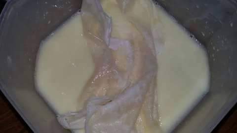 ورقة بسطيلة مفزگة في الحليب مخلط مع بيضة و نص كاس زيت.