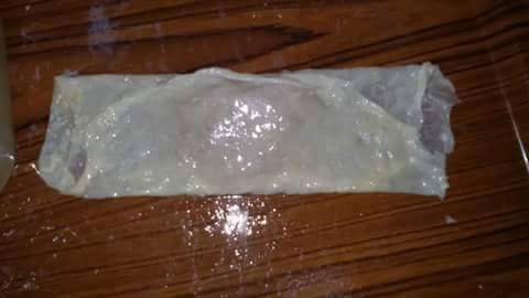 كتغمسي الورقة في خليط الحليب و كتعمريها بالحشوة اللي تحبي أنا درت فرماج كاري أو الكفتة مشحرة مع البصلة العطرية. و تطيبيها في مقلة تقيلة