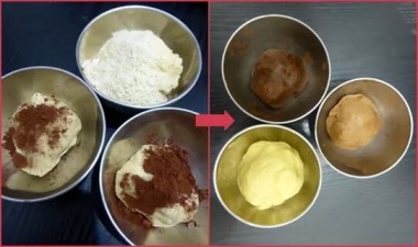 نخلط السكر والزبدة جيدا ثم نضيف البيض نضيف الفانيلا ونجمع بالفرينة دون ان نكثر الفرينة في ااول نقسم الخليط الى ثلاث اقسام قسم نضيف الملعقة الصغيرة كاكاو وقسم نضيف له الملعقة الكبيرة وقسم نتركه ابيض نكمل باقي الفرينة والشرح في الصور