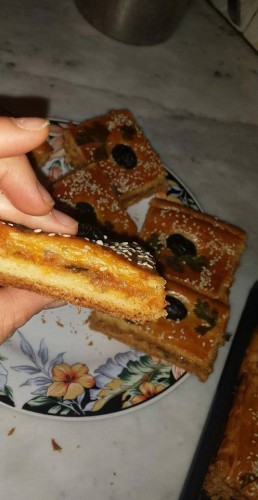 ناخذ كاس الزيت و الفرينة و نبسس بكف اليد ثم نضيف حبة بيض ونعجن بالحليب حتي نتحصل على عجين طري نخليها تخمر ونفرشها وندير الحشو ونزيد الطبقة الثانية وندهن بصفار البيض و نقطع ونرش الجلجلانية وندخلها الفرن