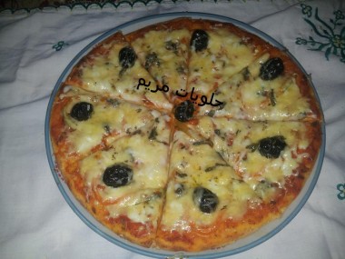 ودهنيها بصلصة الطماطم لي سبق لي حطيتها و دوائر الفلفل اﻷخضر ثم الزيتون اﻷسود ودخليها تكمل طيابها وخرجيها وطفي الفران و حكي فوقها 50غ الموتزاريلا و 50غ فرماج أحمر ودخليها غي يدوب الفرماج وخرجيها متعليش الفران با ميتحرقش الفرماج باش يجي معلك ملي تخرجيها دربي الزبدة و نسميها بالزعتر و كبيه فوقها كتجي لذيذة رطبة و هشيشة.