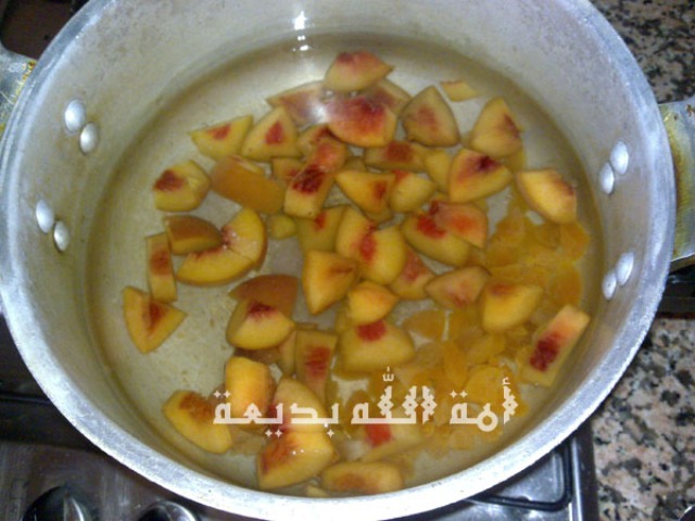 نعسل كل من الخوخ والمشمش ونقطعهم والى بغيتي تقشري الخوخ لا بأس ونعملهم في طنجرة الضغط