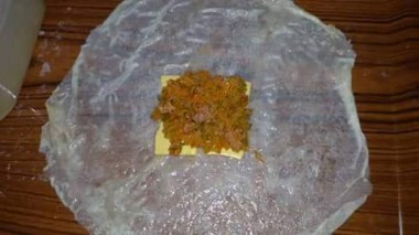 كتغمسي الورقة في خليط الحليب و كتعمريها بالحشوة اللي تحبي أنا دارت فرماج كاري أو الكفتة مشحرة مع البصلة العطرية. و تطيبيها في مقلة تقيلة.