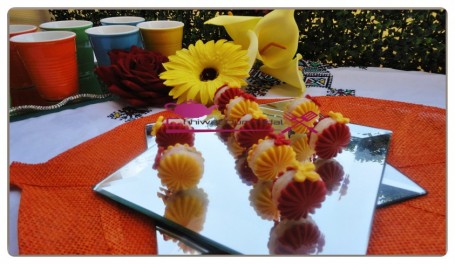 ناخذ الشكلاط الابيض و نقسمه ل نصفين النصف الاول نمزجه مع ملون احمر و الثاني ملون اصفر ثم نصبه في القوالب على شكل وريدات و ندخله للمجمد